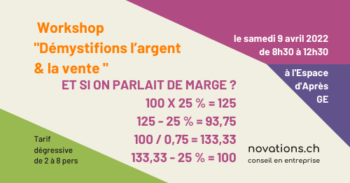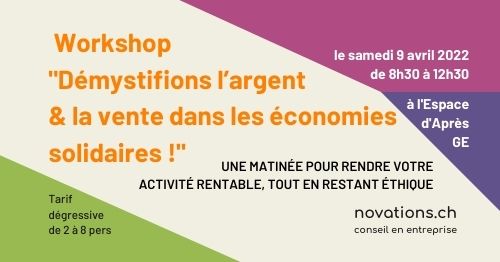 Bonjour à vous toutes et tous, Inscription ouverte pour l'atelier formation "Démystifions l'argent & la vente dans les économies solidaires". Lien pour s'inscrire : https://novations.ch/atelier-commerce-et-vente-ethique/